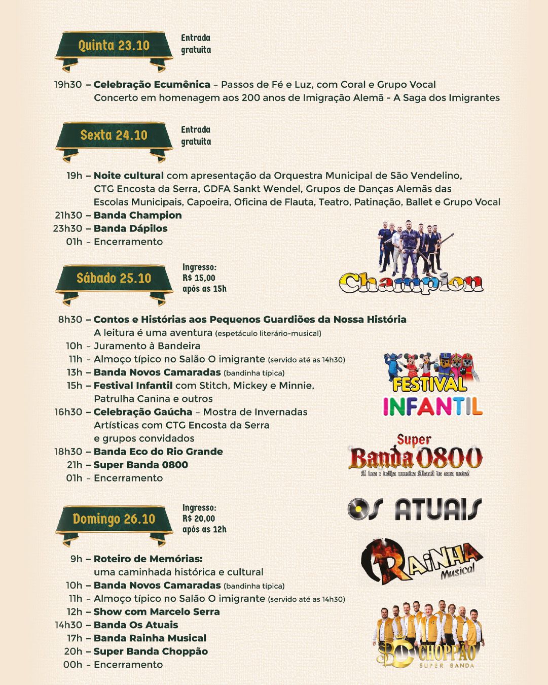 A programação contempla apresentações e encontros culturais, bailes, gastronomia típica, espetáculo cênico musical e atividades para todas as idades. Entre os destaques, está o Espetáculo de Abertura, que conta com a participação de entidades culturais e a comunidade escolar, e a Entrega do Restauro da Casa Canônica, um marco da história local. Construída graças ao grande esforço coletivo da comunidade católica, a Casa Canônica já abrigou, por longos anos, a sede da Prefeitura Municipal de São Vendelino e carrega consigo memórias afetivas e institucionais do município.